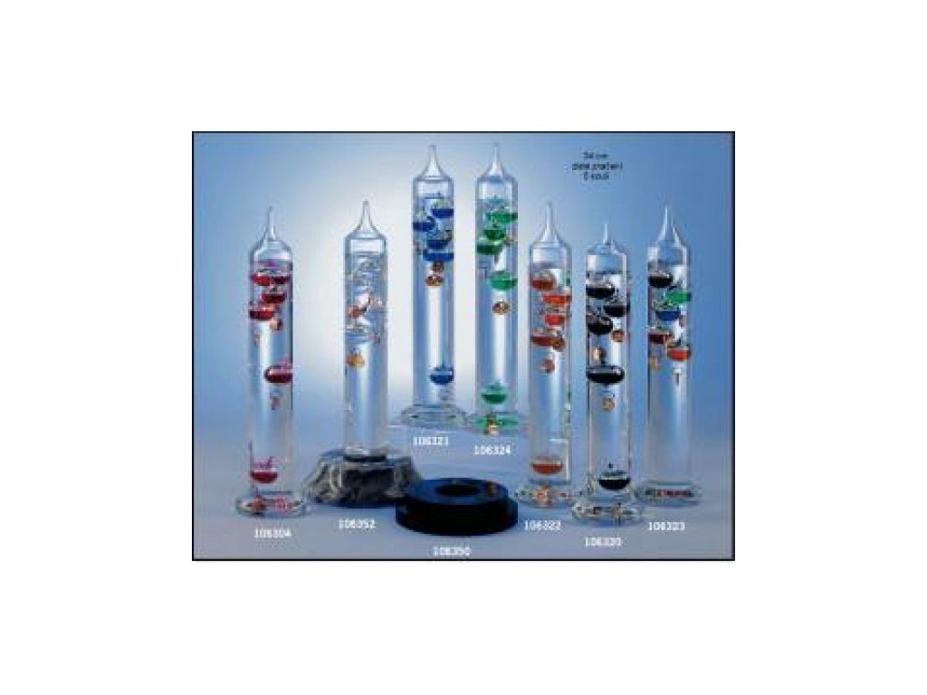 Zhotoven podle návodu Galileo Galilea (1564 - 1642). Galileo Galilei objevil při výzkumu měření teploty metodu měření teploty založenou na změně hustoty vody v závislosti na teplotě. Tím se mění podmínky plavání dutých baněk v kapalině. Do válce naplněného tekutinou vložil několik přesně zvážených kuliček, které pak podle teploty v tekutině klesaly nebo stoupaly. Tím zjistil údaj o teplotě. Pevné těleso je při stejné velikosti a hmotnosti vystaveno v tekutině tlaku k ponořování - při stoupání teploty, ke stoupání - při klesající teplotě. Rozdíl hmotnosti skleněných kuliček za současného působení hustoty tekutiny zaručuje, že vždy správná teplota je udávána nejspodnější z kuliček, které v tekutině plavou. Teplota se dá odečíst z plomby spojené s kuličkou.